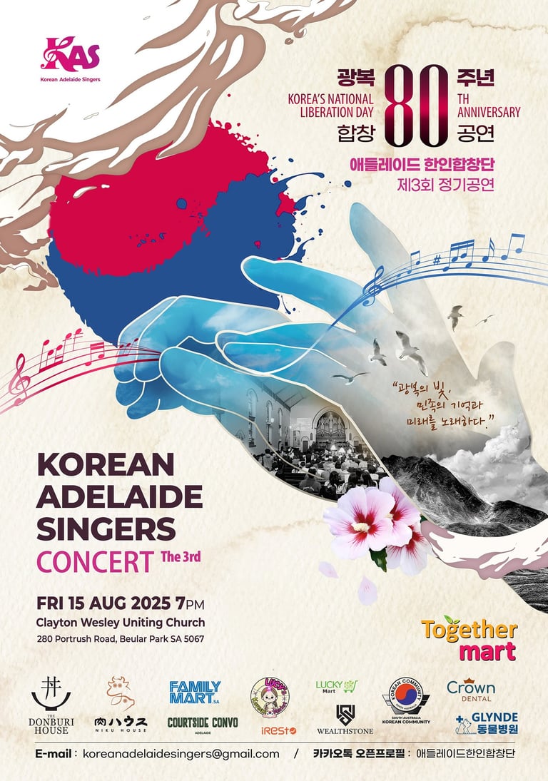 한국의 광복 80주년을 기념하며 감동적인 음악의 밤에 여러분을 초대합니다. 애들레이드한인합창단이 주최하는 이번 공연은 전통 한국 가곡, 현대 합창곡, 그리고 기악 연주로 구성되어 있으며, 희망과 기억, 회복의 메시지를 담고 있습니다. 음악을 통해 과거를 돌아보고 자유의 가치를 되새기는 이 자리는, 세대를 아우르는 목소리가 어우러져 애들레이드 지역사회와 함께 문화적 여정을 나누는 뜻깊은 시간이 될 것입니다.
